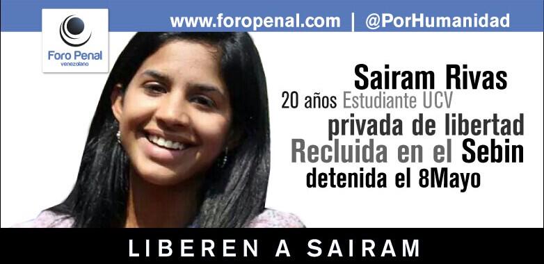 La presidenta del Centro de Estudiantes de la Escuela de Trabajo Social de la Universidad Central de Venezuela, Sairam Rivas, habría salido hoy en libertad condicional, de acuerdo a la información proporcionada por el abogado Alfredo Romero, del Foro Penal Venezolano, la cual ha sido difundida por diario El Nacional, el canal venezolano de noticias Globovisión y diario Notitarde, entre otros medios de comunicación.
