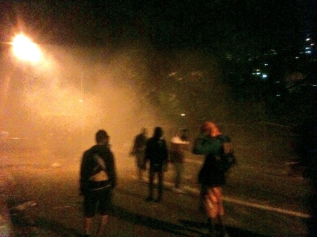 La Avenida Prados del Este se mantenía cerrada anoche, en ambos sentidos, y ardientes batallas contaminaban el aire, haciendo difícil la respiración, principalmente por los gases lacrimógenos que saturaban el ambiente.